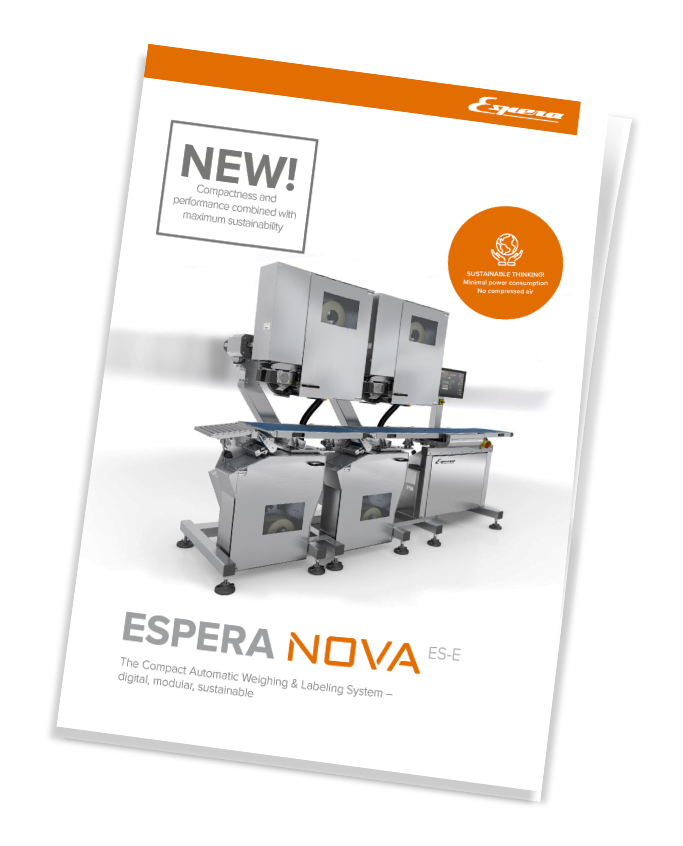 Espera Nova ES-E er et fuldautomatisk vægt-prismærkningssystem, der imponerer med såvel det kompakte design, hastighed på op til 80 pakker i minuttet som det unikke, energibesparende koncept.