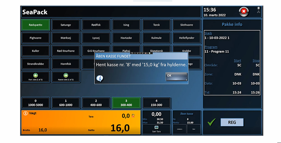 Pakning af fangsten sker hurtigt - uden mange tryk på skærmen. I SeaPack-systemet kan pakkeprogrammerne tilpasses individuelt til en bestemt årstid og/eller et bestemt fangstområde. Så vises kun de relevante fiskearter for den specifikke årstid og fangstområde ligesom rækkefølgen af knapperne med fiskearterne også kan tilpasses. Det gør det hurtigt at bruge systemet og pakke fisken i en fart.