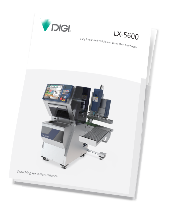 DIGI LX-5600 er en ”alt-i-én” MAP pakkemaskine, der både vejer, forsegler og prismærker MAP-bakker. Det sker hurtigt og effektivt og optimere pakke-opgaverne og produktiviteten i butikken.