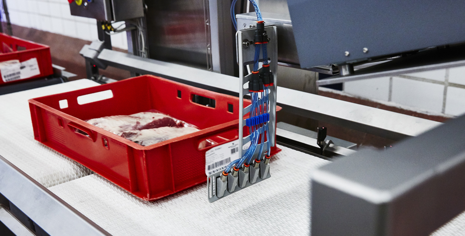 Using a photoelectric sensor at each packing station, the MPL system records which packing station the plastic tray originates from, thereby identifying which retail product is in the tray. When the plastic tray reaches the carton labeling station, a carton label with the correct product description is printed and automatically applied to the tray.