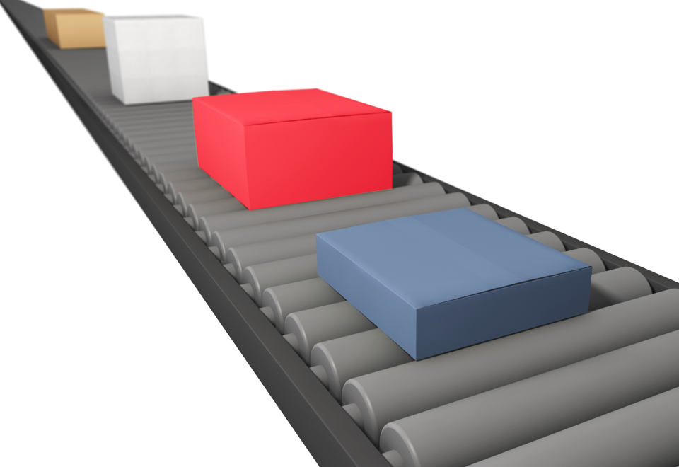 For example, the conveyor system moves three different retail products past three manual packing stations. The operator at packing station 1 is dedicated solely to packing product A, the operator at station 2 only packs product B, and the operator at station 3 handles product C.