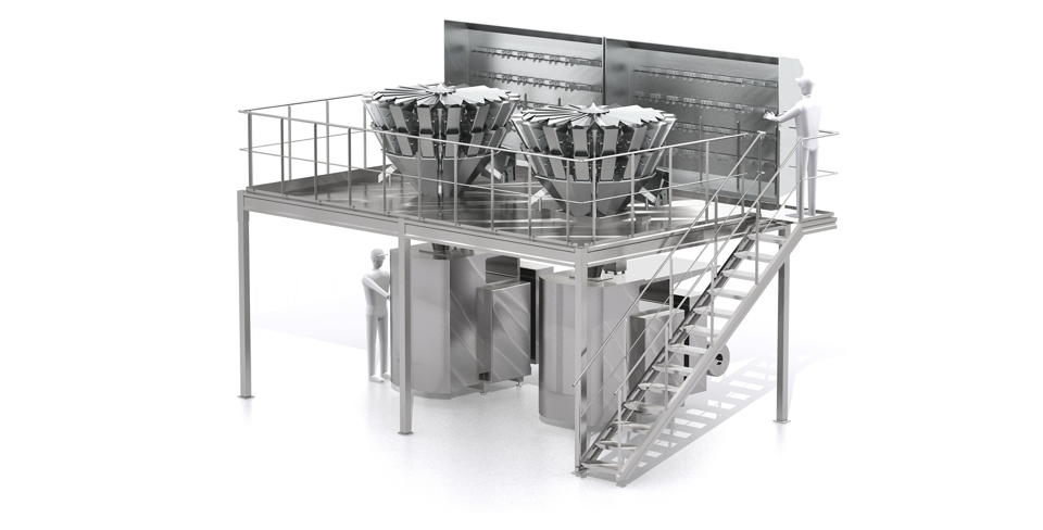 Därefter fortsätter det djupfrysta kebabköttet på transportörerna till en Bilwinco multihead våg för portionering. Multihead-vågen, som levereras av Scanvaegt Systems, har 20 vågskålar som väger och automatiskt delar kebabstrimlorne i 1500g och 400g portionspåsar ned i en påsmaskin.